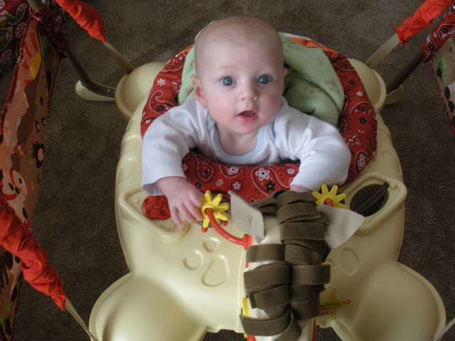 Carter got a big pony jumparoo (one for Gramma and Grampa’s house and one for ours, since they were on sale! See picture above.), lots of clothes (he’s growing!), some books, some toys, and several stuffed animals. My brother also got him this comfy bear pillow that he is currently napping on. See picture.