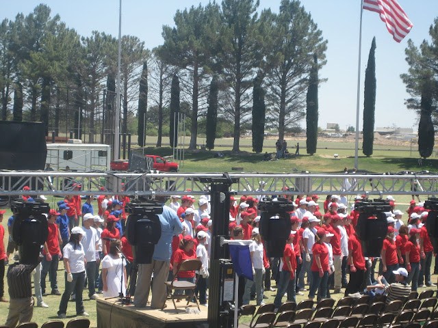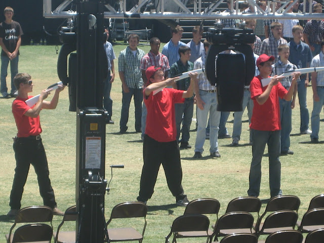 The next morning, we had a rehearsal at 10am, which was very long and HOT! I got to talk to the kids beforehand, which was essential to me, because I fixed a couple of last minute problems in our stake’s dance (we made a huge American flag out of the dancers, and some red and white kids were ending up in the blue section!). Daniel and Carter and I spent some of the rehearsal in the stands (while I took pictures), and some of the time we went down to the grass where there was shade! After it was over, we went and got some lunch and all three of us took naps! I went back around 5:30 to get some of the pizza they were providing for the performers and leaders, and then the three of us went to the field around 6:30 to get our seats. The place was already packed, but we ended up with really great seats almost right behind President Monson!