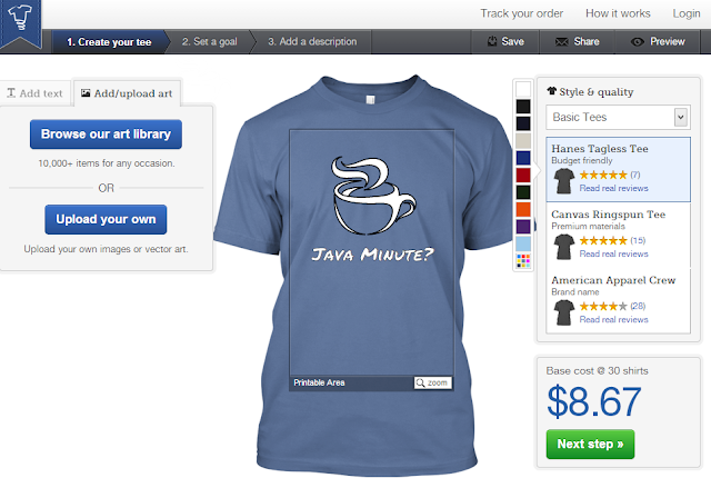 Once you have your design the way you want it, you decide (based on the base price) on your goal number of shirts to sell. The base price is based on the shirt you choose, the number of colors, the complexity of your design, and the goal number of shirts to sell. The higher your goal, the lower the base price of the shirts. Then you price your shirt. If your shirt costs $8 at base price, and you price it at $10, then you earn (or raise) $2 per shirt that you sell.