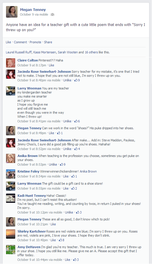 Last week Carter wasn’t feeling well, so I ended up keeping him home for two days. Of course on one of the days I did send him, he threw up…on his teacher. And of course that resulted in me asking this on Facebook: