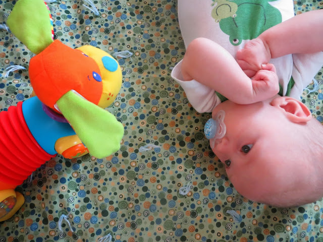 Harrison is still a couple of months away from crawling, but he just started rolling over, and Fred is definitely encouraging him to do that!